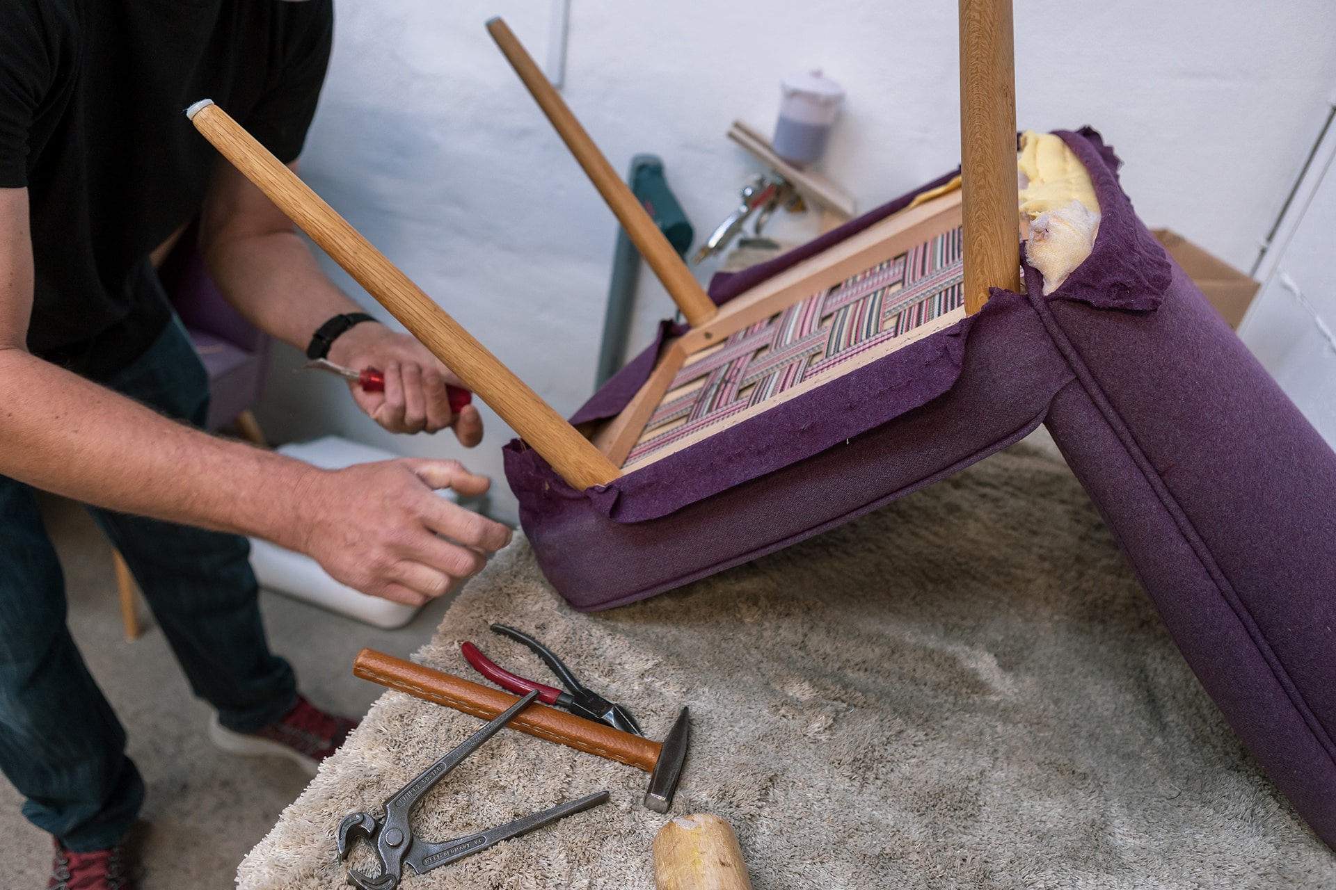 Im Rahmen einer vollständigen Aufarbeitung wird das Möbelstück zunächst komplett zerlegt. Der alte Bezug wird entfernt, wobei er oft als Schnittmuster für den neuen dient. Die freigelegte Polsterung wird begutachtet und je nach Zustand teilweise oder vollständig erneuert. Bei älteren Stücken mit traditioneller Federung können einzelne Federn nachgespannt oder ausgetauscht werden. Das Gestell wird auf Stabilität geprüft und bei Bedarf neu verleimt oder verstärkt. Erst wenn alle Komponenten in einwandfreiem Zustand sind, wird der neue Bezug aufgebracht.
